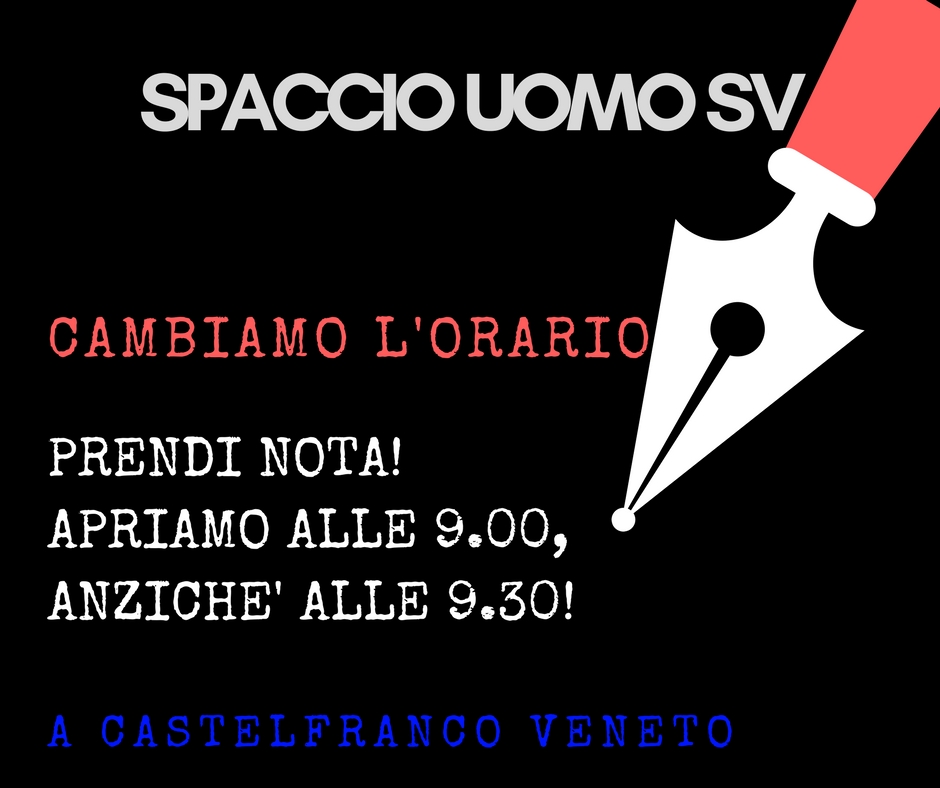 Lo Spaccio Uomo SV di Castelfranco Veneto cambia orario di apertura. Dal 1 aprile aprirà alle 9.00 anziché alle 9.30. Rimane invariato l’orario di apertura del pomeriggio ovvero 15.30 19.30 anche nel periodo estivo.